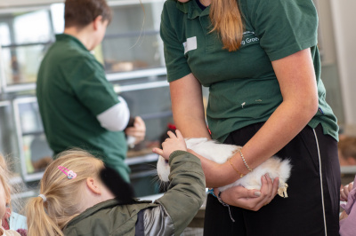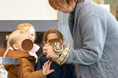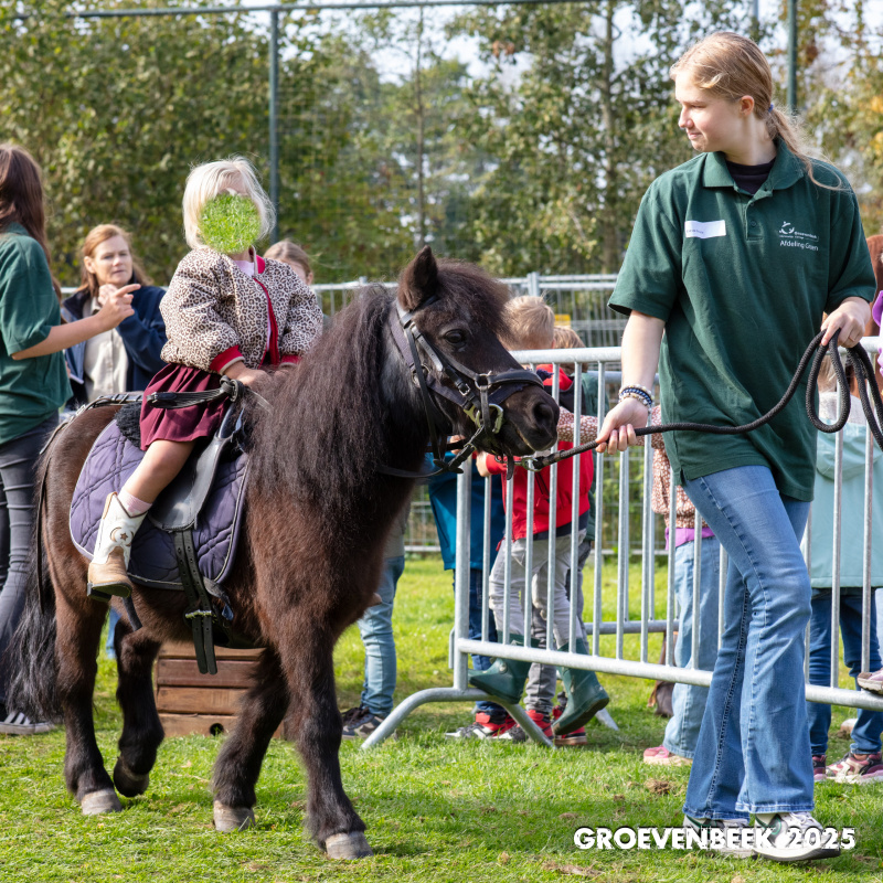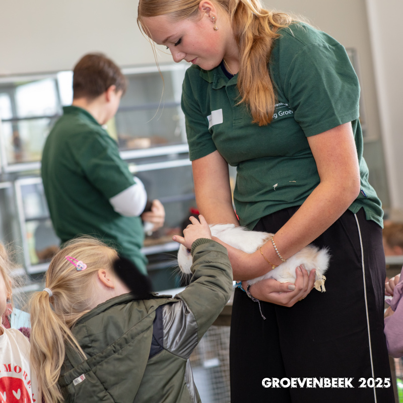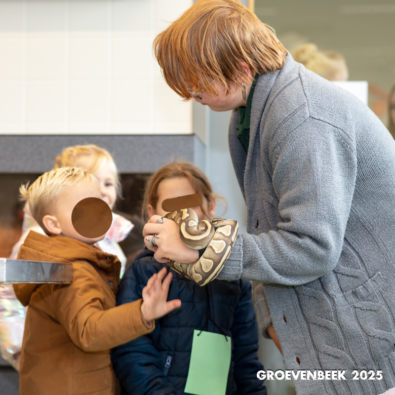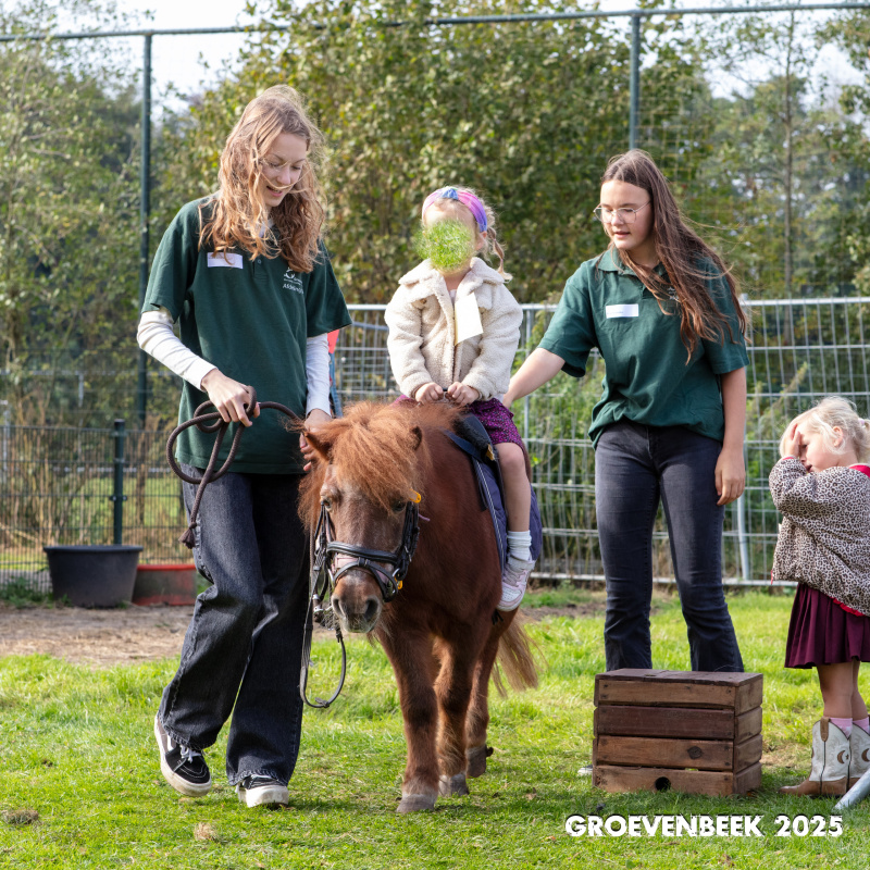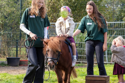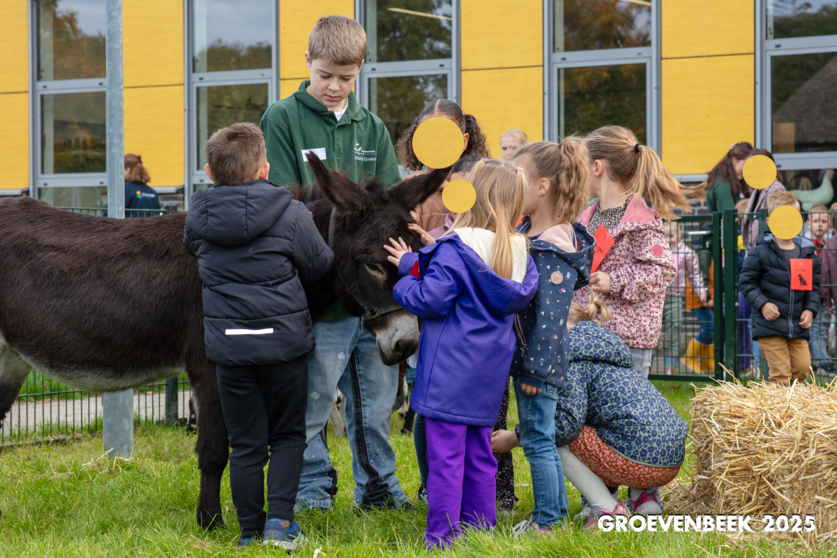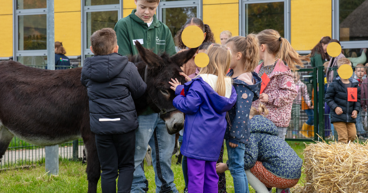 Vandaag bezochten 420 Ermelose kleuters onze Aai- en knuffeldag. Meneer Vissia en mw. Vreemann hadden alles weer tot in de puntjes voorbereid. Onze eigen Groen-leerlingen begeleidden de groepjes langs de kuikentjes, het ponyrijden, koe melken, de reptielen en knaagdieren, etc. De kinderen keken hun ogen uit bij de slangen, schildpadden, mandrils en gerbils. Soms een beetje spannend, maar vooral heel erg gezellig! Voor onze eigen leerlingen was dit een curriculumonderdeel dat ook beoordeeld werd.