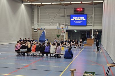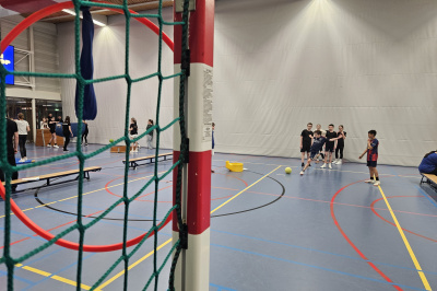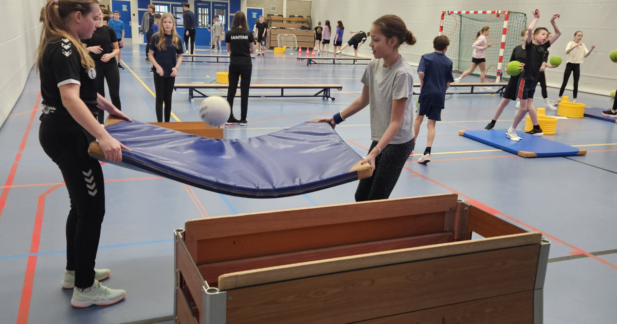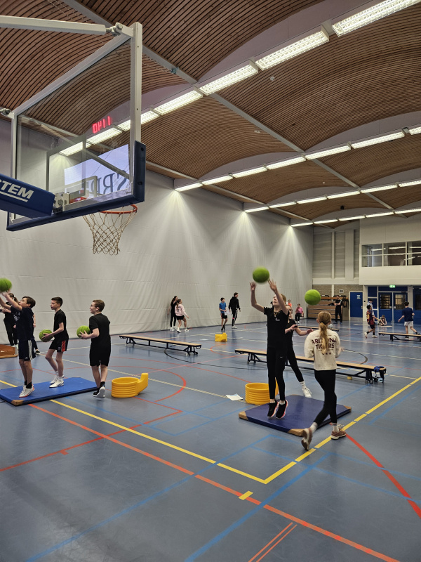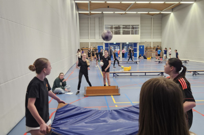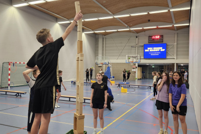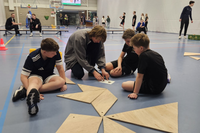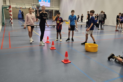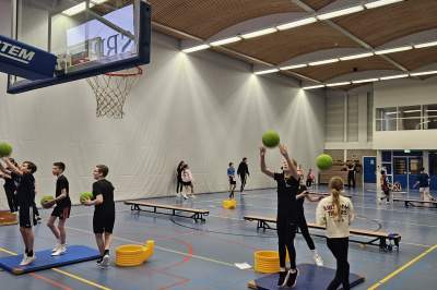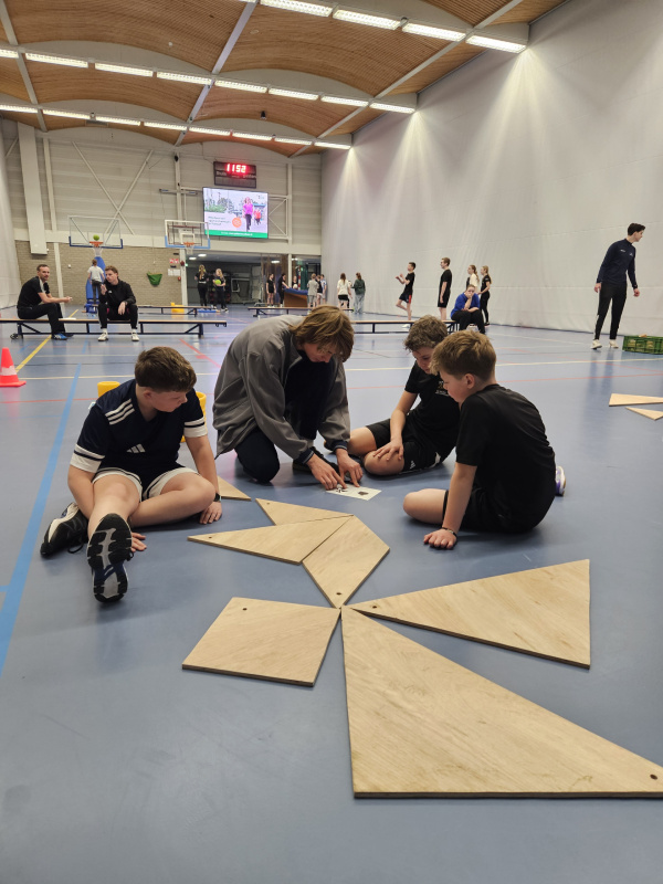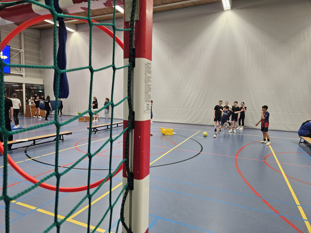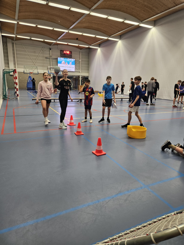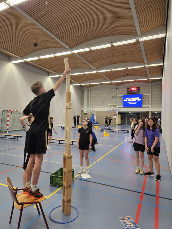 Voor deze dinsdag had hij, samen met een medestudent, een leuk spellencircuit in de sporthal de Putter Eng uiteengezet. De leerlingen gingen in groepjes de verschillende spellen langs en konden bij elk spel punten scoren.