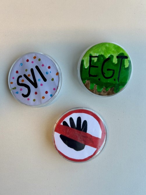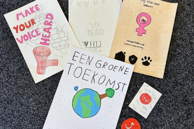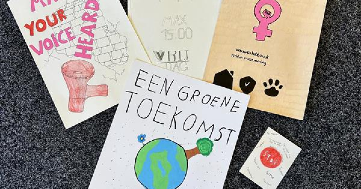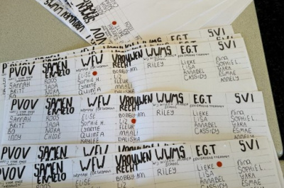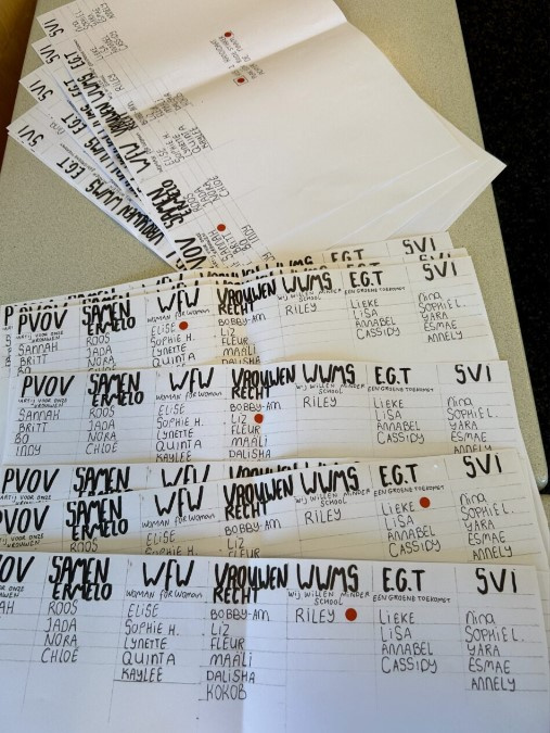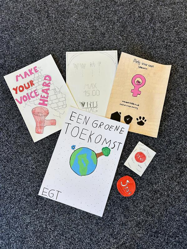 De vmbo-kunstklas van de donderdagochtend hield vandaag verkiezingen als afsluiting van een creatief project. In groepjes richtten leerlingen hun eigen politieke partij op, met bijpassende standpunten en een zelfgeschreven protestlied. Daarnaast ontwierpen ze campagnemateriaal zoals affiches, flyers en buttons.